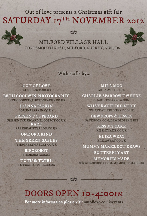 Christmas Gift Fair tomorrow in Milford, Surrey. We'll be there with all the other lovely stall holders listed below - a taster of which you can see in our